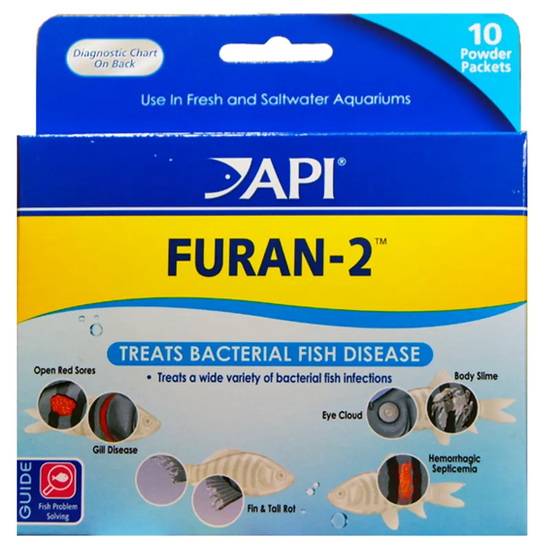 API® Furan-2 powder Contains two furan compounds to combat a wide variety of gram-positive & gram-negative bacterial diseases, including bacterial gill disease, open red sores (Aeromonas spp.), body slime & eye cloud, black molly disease (Flavobacterium columnaris) and fin & tail rot. For use in both freshwater and saltwater aquariums. This medication will harm the biological filter. Note: This medication will cause a slight discoloration of water which can be removed with activated carbon.
