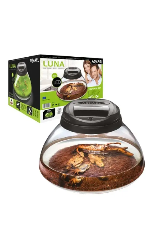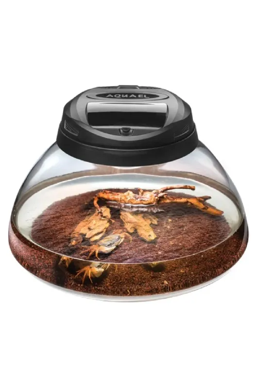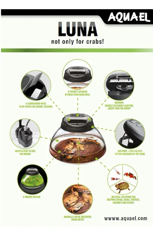 The LUNA set is perfect for keeping fashionable small crabs, young turtles, newts, and other semi-aquatic animals. Thanks to the shape of the tank, animals can be conveniently observed from above. Its wide bottom can be used to arrange eye-catching interior designs with multiple hiding places that provide optimum living conditions for the inhabitants. The set can be used as an original shop-counter decoration. The LUNA set is also suitable for keeping the popular dwarf shrimps or for creating plant aquariums for growing mosses, etc.