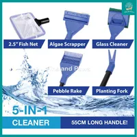 Aquarium 5-in-1 Cleaning Kit - Algae Scraper Fish Net Glass Cleaner Pebble Rake and Planting