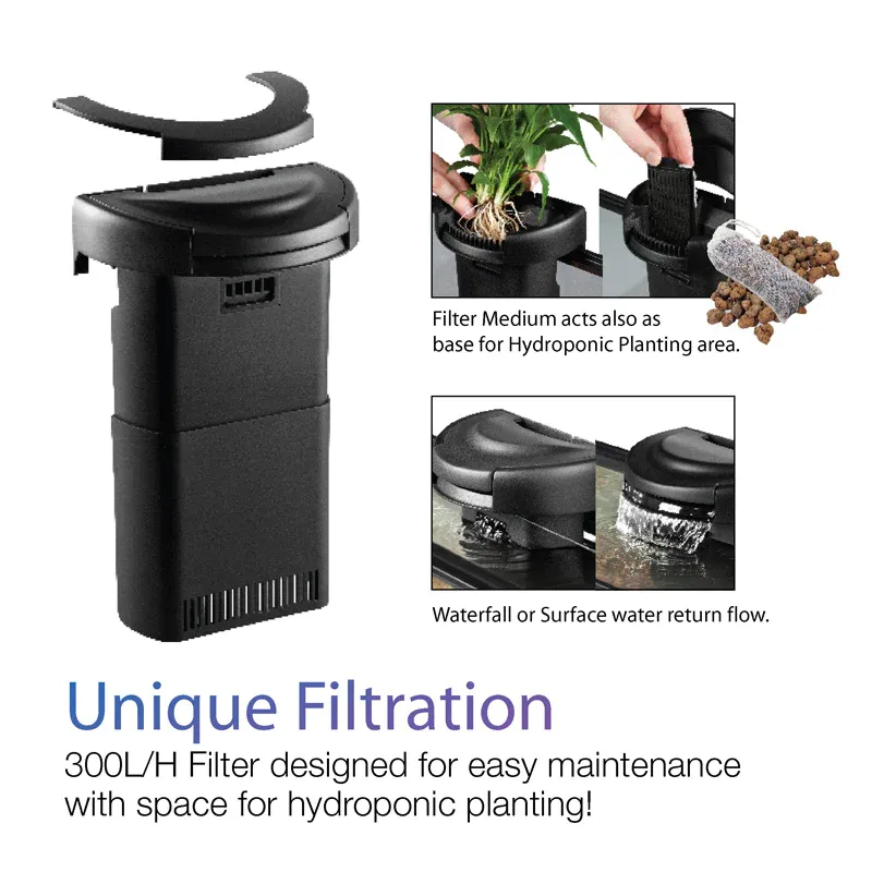 The filter not only helps to keep the water clean, it also features a Hydroponics area which when used with the Hydrocorn (provided) allows you to grow plants suited for hydroponics growth. The Hydrocorn also acts as a biological filtration that helps break down toxins produced from fish waste such as Ammonia and Nitrite.