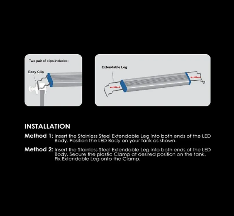 • Easy to Install. Extendable Leg and Clamp (included) allow the light to be easily mounted.