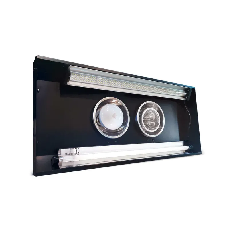 ThermalZooPro has been handmade from the finest materials and designed to create a usable flood of energy directly below the fitting. ThermalZooPro has 2 independently switched heat sources and your choice of either 2 ProT5 fittings or 1 ProT5 and 1 JungleDawn-LED Bar. We have adapted our best selling ProT5 and JungleDawn-LED Bar fixings to ensure that their projection of light cross with the heat sources below the fitting. This ensures a smooth flood of full-spectrum lighting over the whole terrestrial spectrum from UV to IR.
