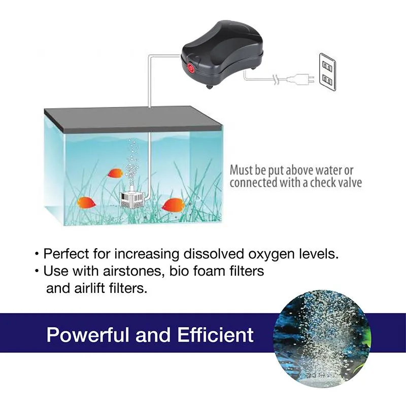 The SE Silent Air Pump is a small, powerful and silent air pump. It helps to increase dissolved oxygen levels within your tank, which is important when keeping large number of fishes or during treatment.