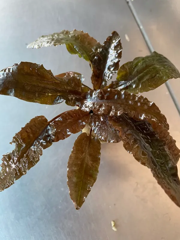 This beautiful variety with the dark, hammered leaves is named after 'Tropica'. When grown in an open space the leaves will virtually lie on the bottom. It is suitable for small aquariums with leaves from 10-20 cm, and a rosette from 10-20 cm wide.s