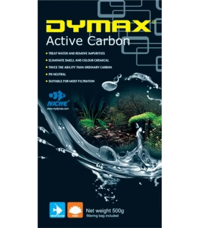 Dymax Active Carbon treats water and remove impurities, eliminates smell, colour and chemical in aquarium water. Breaks down carbolic acid, tannic acid, chlorine in tap water.