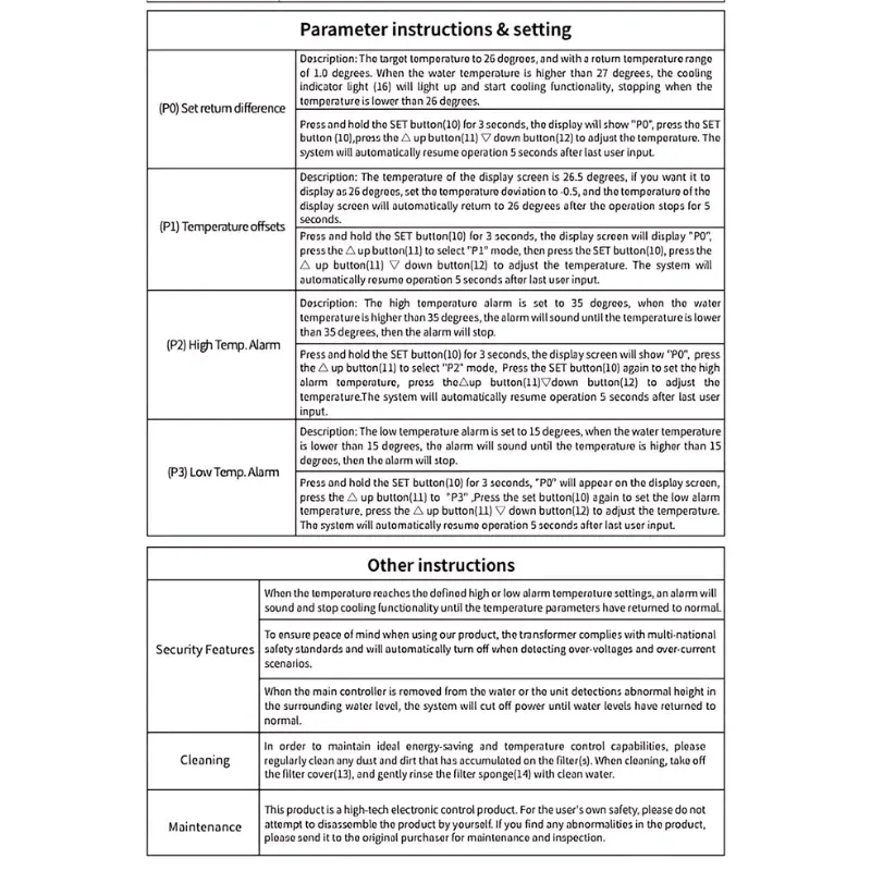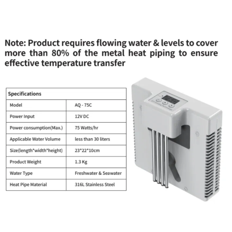 For those curious about specifications, it operates on DC 12V with 75W power and features an adjustable temperature difference setting to regulate its operation. For instance, when set at 25 degrees Celsius with a 1-degree temperature difference, the chiller will halt operation at 25 degrees Celsius and resume at 26 degrees Celsius.