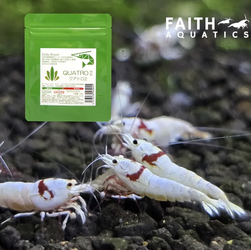 The concept of quatro2 is "natural shrimp food made from only natural ingredients." We are not bound by fixed knowledge of nutrition, but instead contain dozens of natural minerals derived from raw materials, and are formulated with fast-acting spirulina, primarily to improve body color and strengthen the body surface. In addition, since they are good eaters, it is easy to adjust the number of feedings, and the level of growth can be taken into account. The feed composition is completely opposite to that of our product ``Hinomaru Bento'', and we have taken into consideration that the necessary nutrients can be obtained from raw materials alone as much as possible. Since it is made of 100% plant-based ingredients, it can be fed daily as a plant-based feed. It can be used for all kinds of ornamental freshwater crustaceans such as Red Bee Shrimp, Minami Numa Shrimp, and Yamato Numa Shrimp, as well as shellfish such as Ramshorn.