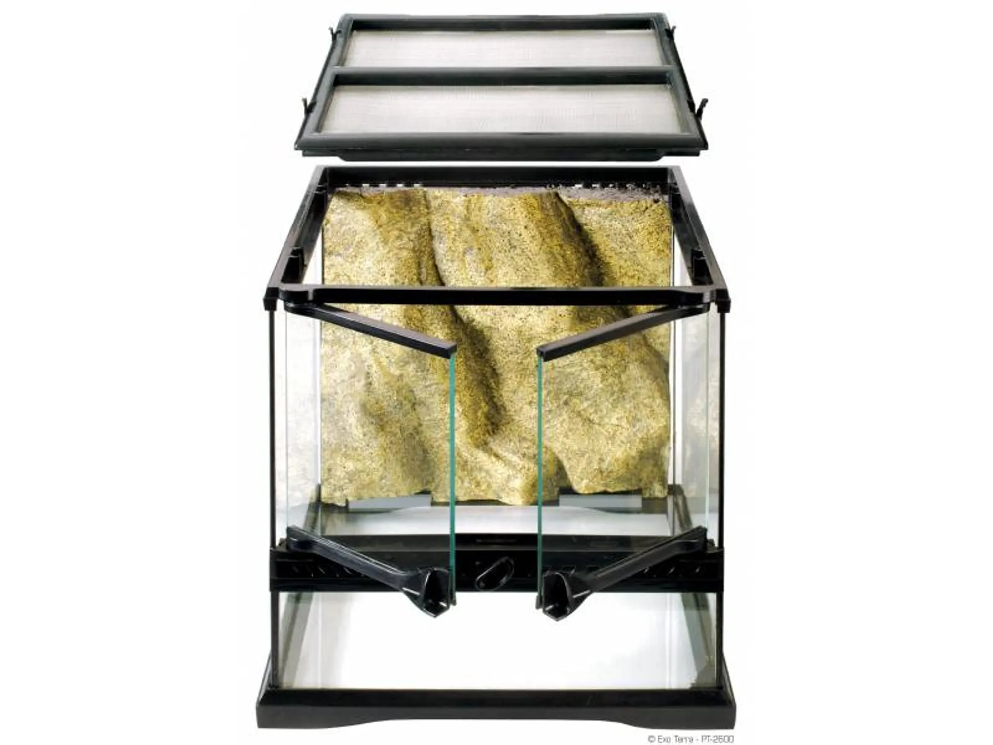 The Exo Terra Glass Terrarium is the ideal reptile or amphibian housing designed by European herpetologists. The front opening doors allow easy access for maintenance and feeding. A specially designed lock will prevent escape and the doors can be opened separately. The full screen top ventilation allows UVB and infrared penetration, and is completely removable for easy access while decorating or cleaning. In the back of the screen cover are 5 closable wire or tube inlets on both sides to install Heat Wave Rocks, Waterfalls, sensors, etc. inside the terrarium. The bottom plate of the terrarium is raised to mount a substrate heaterto heat a part of the extended ground surface. The extra high fixed front window is ideal for thick layers of substrates (burrowing reptiles), aquatic parts (paludarium) or to mount an Exo Terra reptile den. The natural background is in the same colour like all other Exo Terra decoration items (Water Dishes, Waterfalls, Heat Wave Rocks, etc.) and provides an extra climbing dimension.