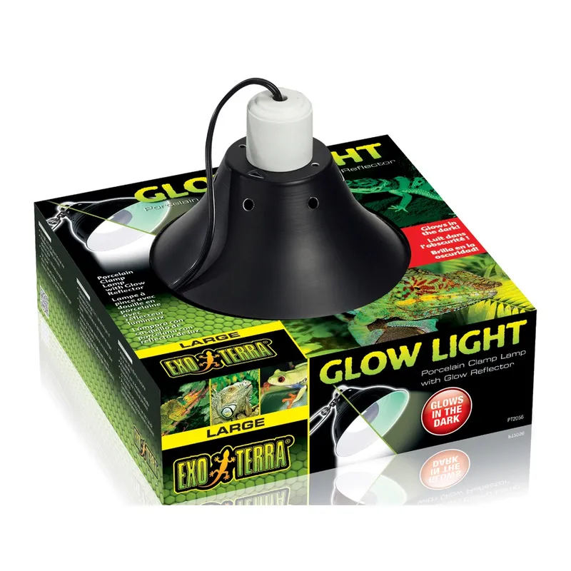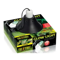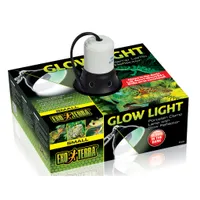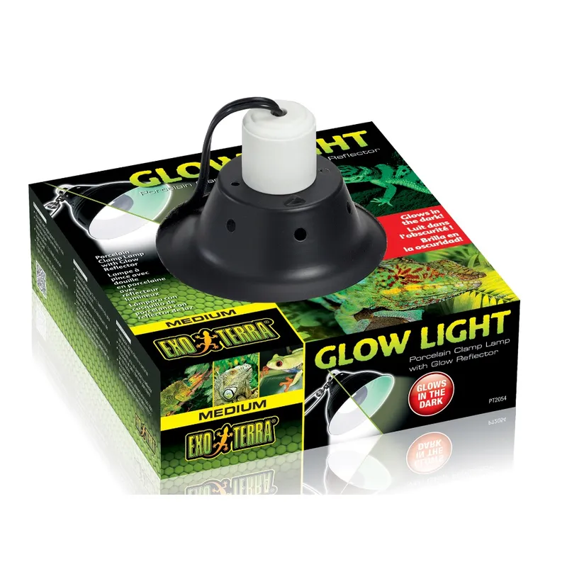 The Exo Terra Glow Light gives you the versatility of placing heat and/or light sources on your terrarium where needed. The device is sturdily constructed, with a metal reflector, heat resistant ceramic socket, and a spring-loaded swivel clamp. It can be easily turned off and on by the switch, mounted on the extra long power cord. The inside of the reflector is coated with a highly reflective luminous coating that continues to glow long after the lamp is turned off. This allows diurnal reptiles and amphibians to retreat in their night burrow or hiding without stress. A moon-like glow enables nocturnal reptiles and amphibians to see properly without disturbing their night cycle. It is also ideal to monitor your animals during night time, without switching on the lights which can cause stress and disorientation.