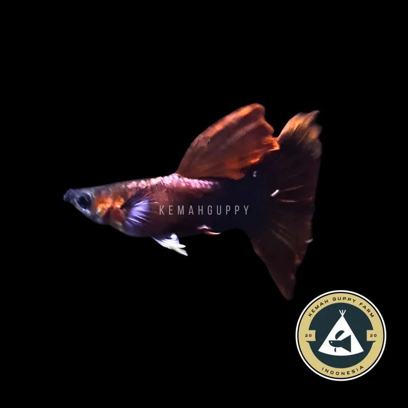 The Guppy Red Velvet Blue Ear is a visual standout. Its deep, velvety maroon body contrasts elegantly with bright blue pectoral fins, often called the "blue ear." The base of the tail is brushed with a subtle magenta tint, leading to a large, fan-like delta tail that sways gracefully through the water. The combination of bold and soft hues makes this guppy an irresistible centerpiece in any aquarium.