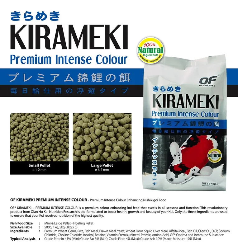 - Kirameki Koi Intense Colour is a premium colour enhancing Koi food that excels in all seasons and function.
