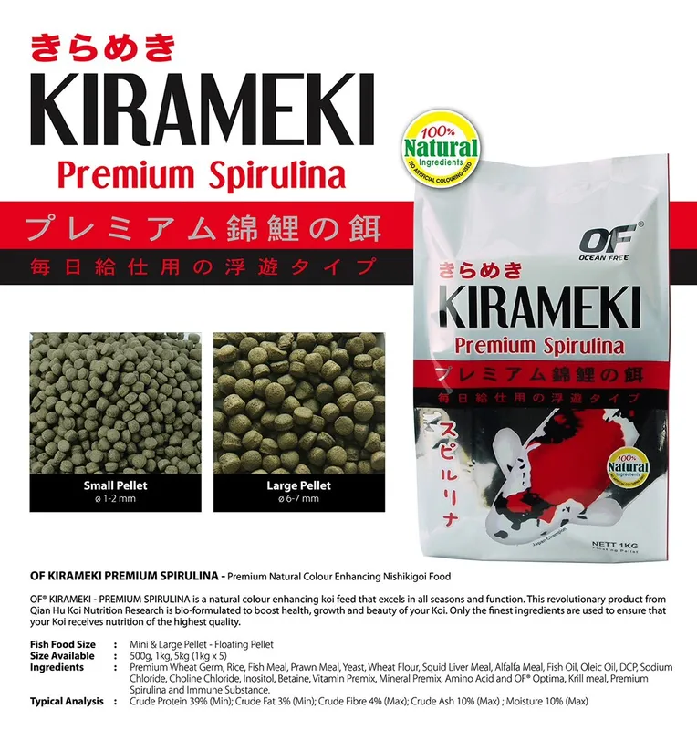 - Kirameki Koi Spirulina is a natural colour enhancing Koi food that excels in all seasons and function.