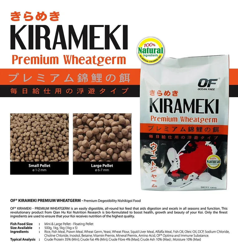 - Kirameki Koi Wheatgerm is an easily digestible, all-round Koi food that aids digestion and excels in all seasons and function.