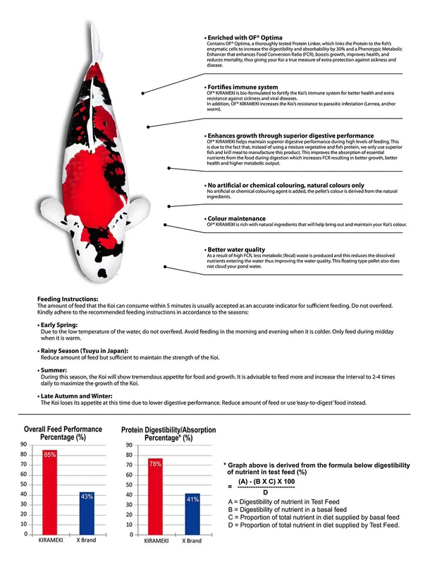 - Enriched with OF® OPTIMA. Contains OF® OPTIMA, a thoroughly tested Protein Linker, which links the Protein to the fish’s enzymatic cells to increase the digestibility and absorb-ability by 30% and a Phenotypic Metabolic Enhancer that enhances Food Conversion Ratio (FCR), boosts growth, improves health, and reduces mortality, thus giving your Koi and Goldfish a true measure of extra protection against sickness and disease.