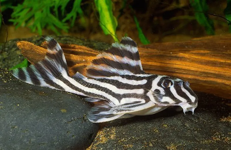The Zebra Pleco showcases a distinctive black and white striped pattern that covers its entire body, resembling the stripes of a zebra.