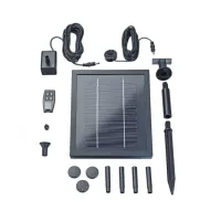Solar fountain set for attractive fountains even when the sky is overcast or in the twilight hours. Different water patterns can be created with the 4 different nozzle heads. In the evening the LED lighting ensures a nice atmosphere and remote control offers more convenience. The set includes a fountain pump with a capacity of 250 l/h with the latest rechargeable battery technology. A solar panel module is also a component of the set. Maximum fountain height: 0.6 m.