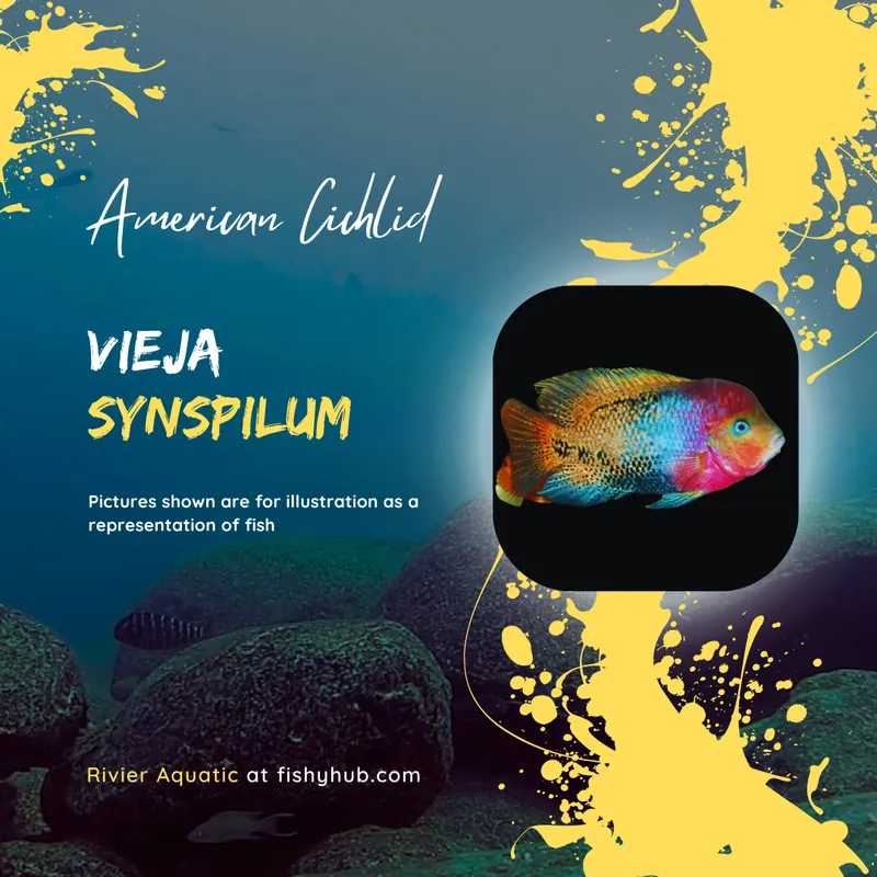 Vieja synspilum, also known as the Redhead Cichlid or Quetzal Cichlid, is a majestic species native to the rivers of Central America. Renowned for its brilliant mix of red, orange, turquoise, and gold, this cichlid displays some of the most vibrant colors found in freshwater fish — especially in mature males.