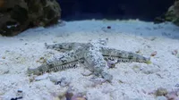 The Sand Sifting Sea Star, at first glance, seems to be drably colored like most bottom dwellers. But closer inspection reveals a striking beauty and serenity to the alternating bands of brown and beige that dress this invertebrate's thick, spine-covered arms. Like other starfish, Astropecten polycanthus efficiently consumes mass amounts of detritus and uneaten foods.