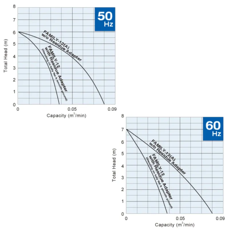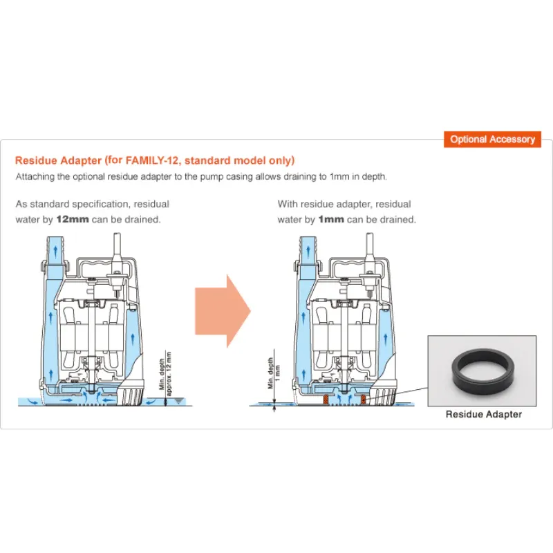Moreover, it can be used as a residue pump and drain water to 1mm in depth by attaching the optional residue adapter to the pump casing (for FAMILY-12, standard model only).
