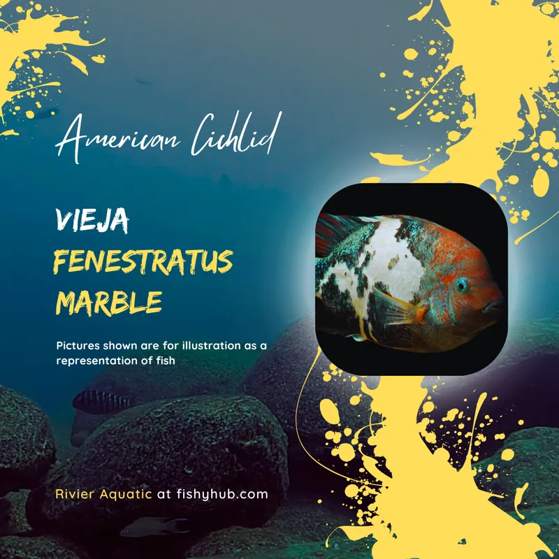 Vieja fenestrata Marble is a large, robust cichlid known for its striking marbled pattern. The body displays a mix of light and dark patches, creating a marble-like appearance that makes it highly sought after among hobbyists. Adult coloration includes shades of blue, gray, and brown, with males often exhibiting more intense patterns and subtle iridescent highlights.