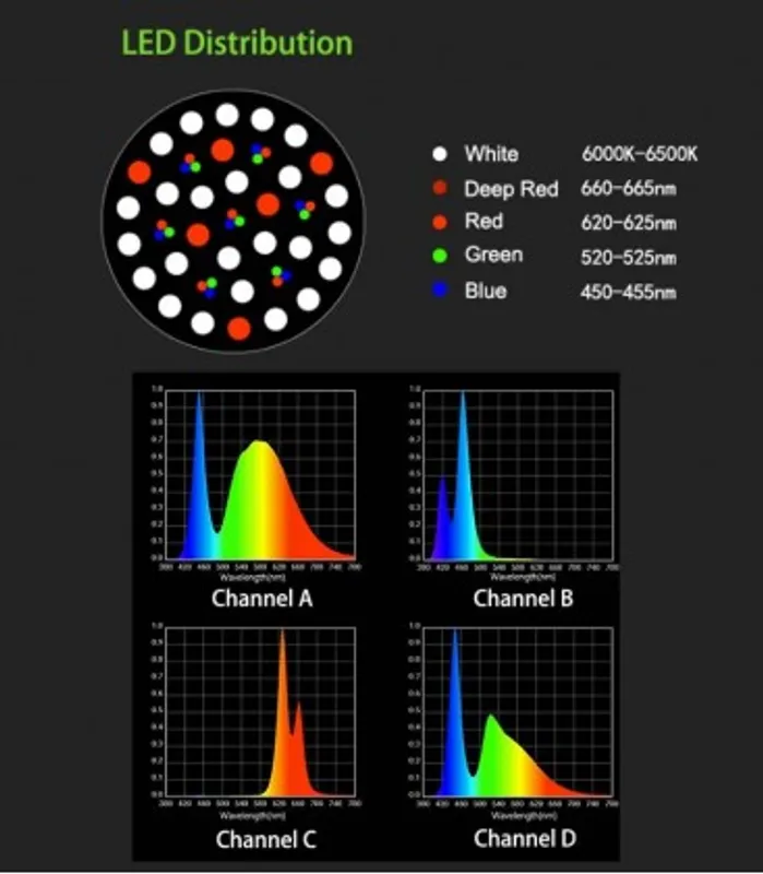 The Zetlight ZE-8600F is designed to provide precise spectrum colours necessary for aquatic plants. The LED color temp/wavelength specifications: